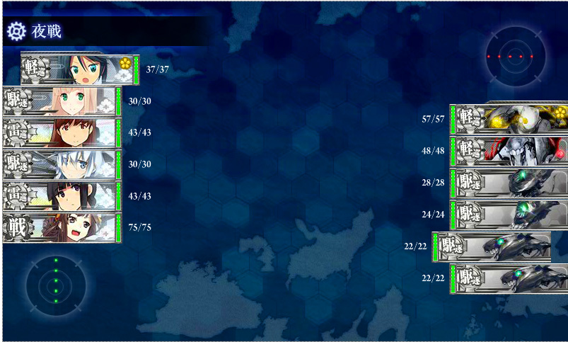 今回のイベント海域は2箇所が夜戦、E-1は敵潜水艦多め、E-2は回避・高速艦(駆逐艦多めオススメ)でボスまで単横陣で逃げ切り、ボスで単縦陣な攻略が有効みたい。