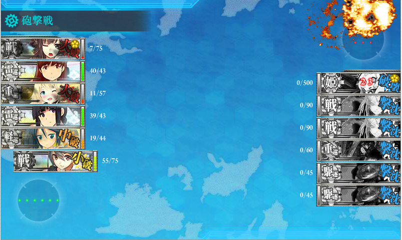 昼戦に持ち込めればむしろこっちのもので、駆逐艦と雷巡でぼっこぼこにできるので、かなり簡単に耐久ゲージを削ることができます。 そんなこんなでー