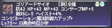 ゴリアードサイオ:胴◆防42 HP+42 MP+42 コンサーブMP+5 敵対心-5 ヘイスト+4%